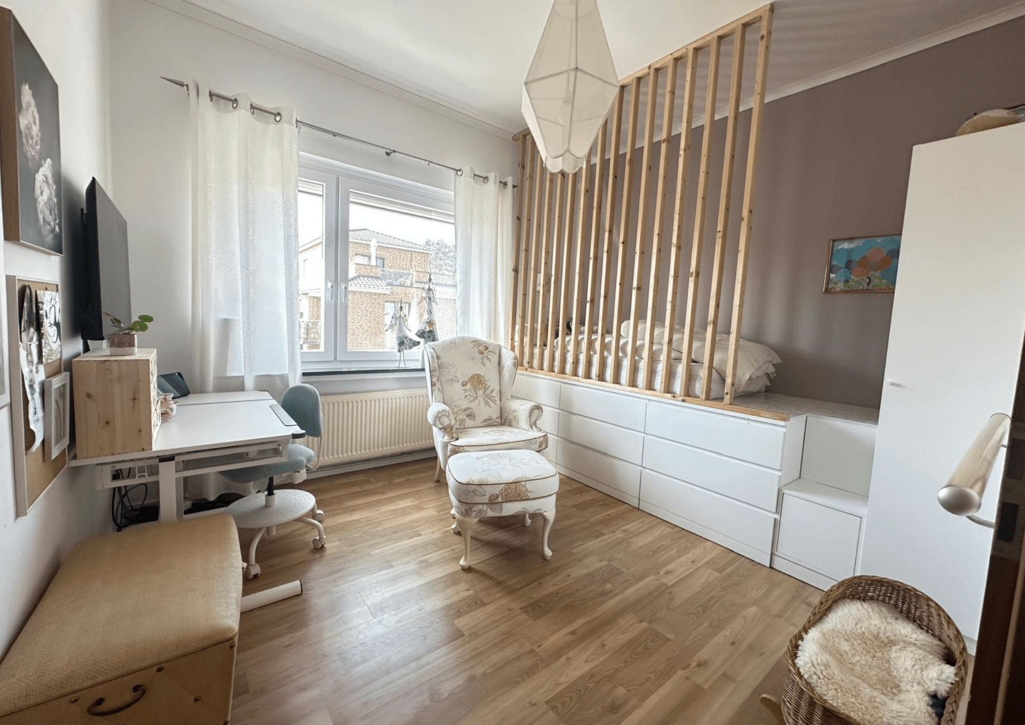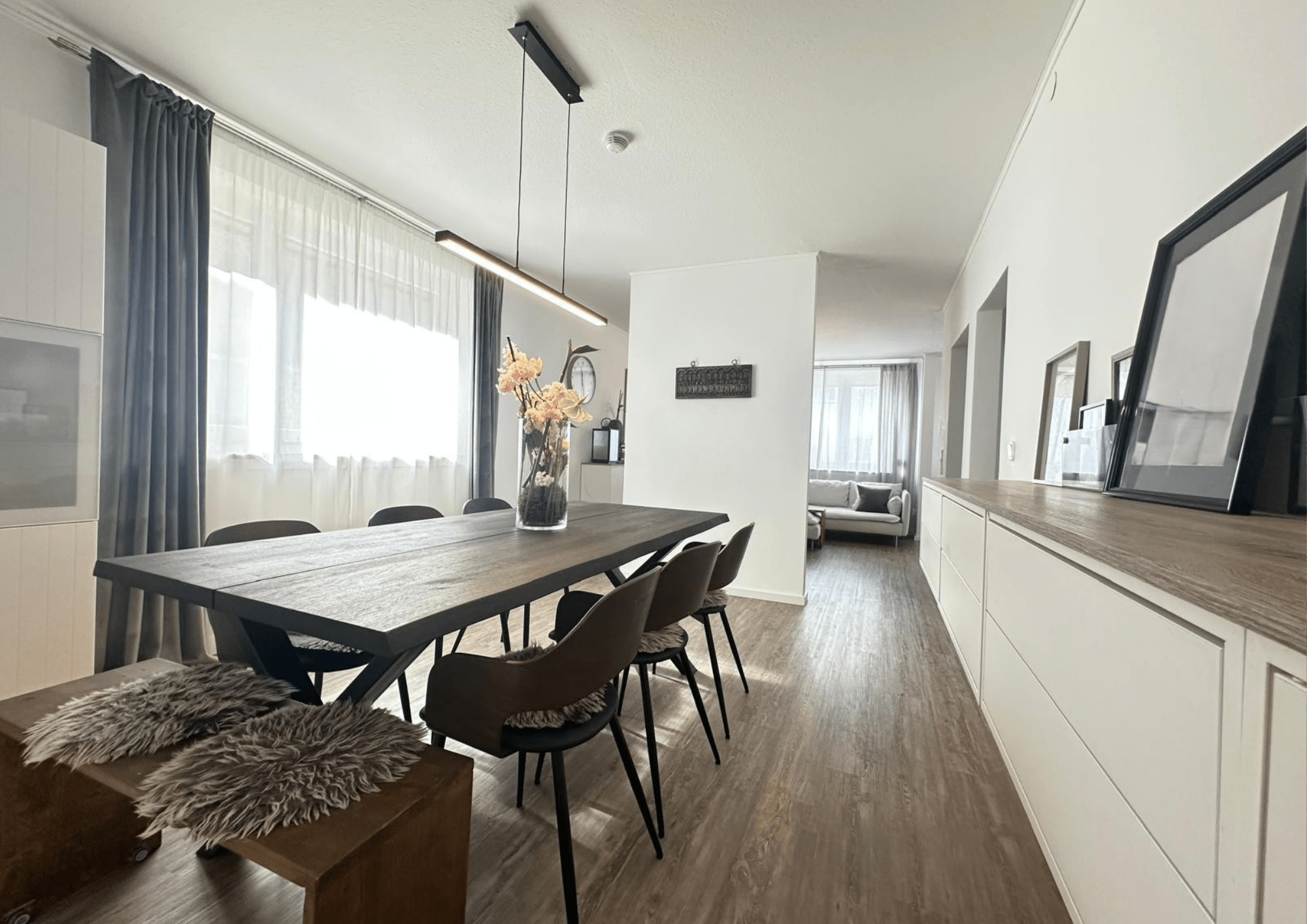 Die Innenausstattung umfasst hochwertige Bodenbeläge in Form von Laminat, Fliesen und PVC und teilweise Fußbodenheizung, die je nach Bereich stilvoll und funktional eingesetzt wurden. Praktische Einbauküchen sind bereits vorhanden und runden das wohnliche Ambiente ab.